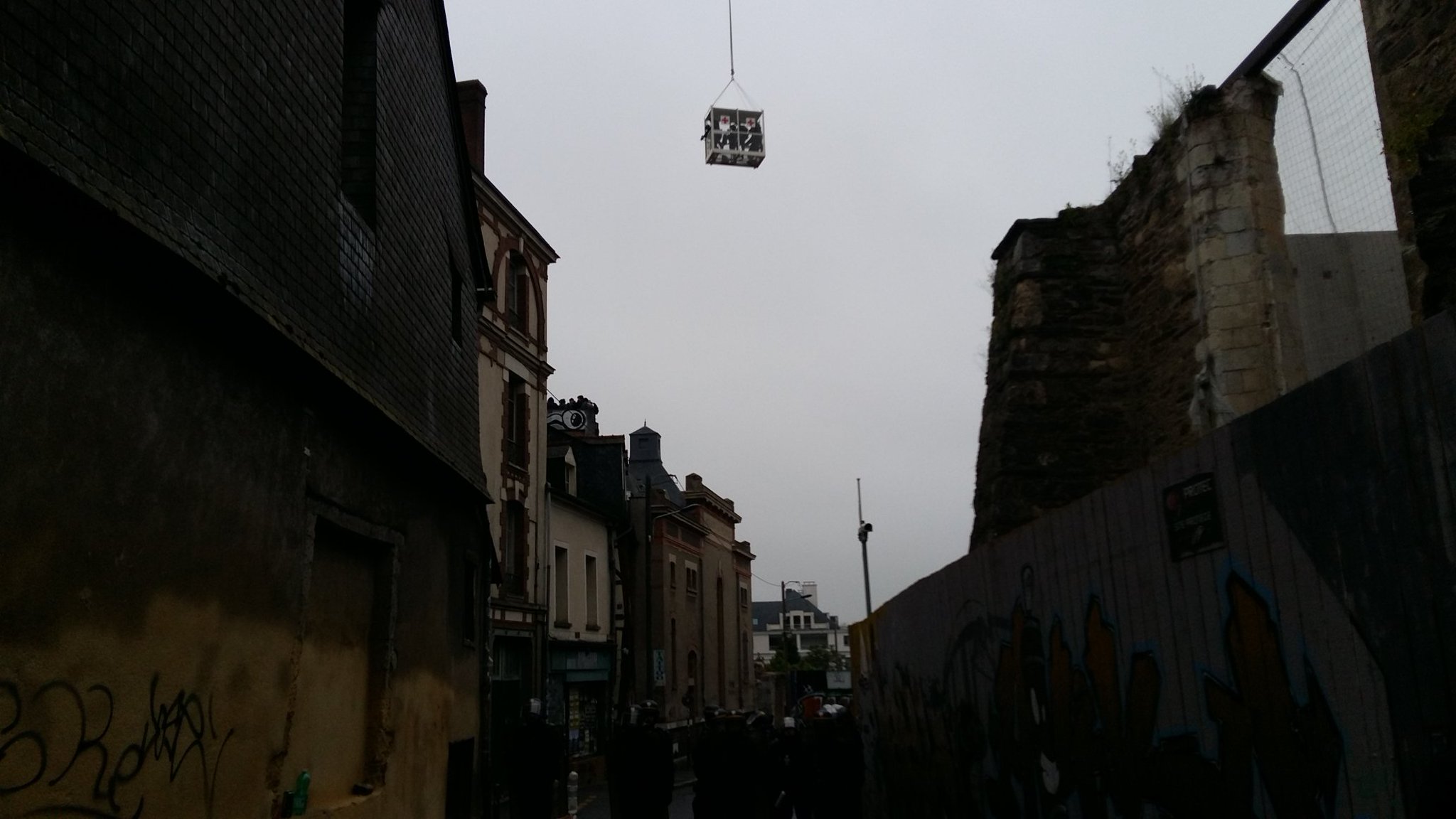 A #Rennes les manifestants installent des barricades face au CRS place ste Anne pic.twitter.com/cyINByhfFX— FB Armorique (@bleuarmorique) 13 mai 2016