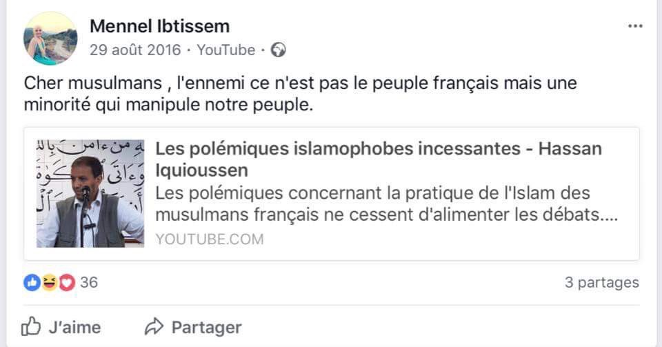 "Quelques heures plus tard, ses tweets et vidéos postées sur les réseaux sociaux étaient écumés... Très rapidement, des internautes lui ont reproché certains de ses messages postés au lendemain de l'attentat de Nice, ses positions en faveur du peuple palestinien ainsi que le fait d'avoir partagé une vidéo de Tariq Ramadan.